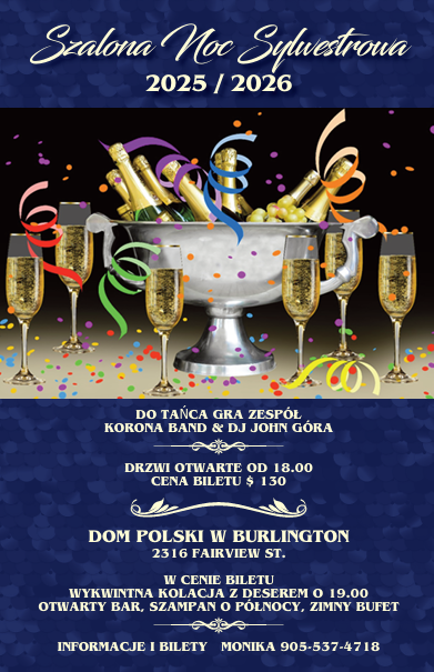 The Polish Hall in Burlington cordially invites you to New Year's Eve - December 31st at 6:00 PM. Featuring the band Korona and DJ Jan Gora. Tickets are $130 per person. Dinner, dessert, champagne, open bar, and buffet. For tickets, call: Monika at 905-537-4718. We look forward to seeing you!
