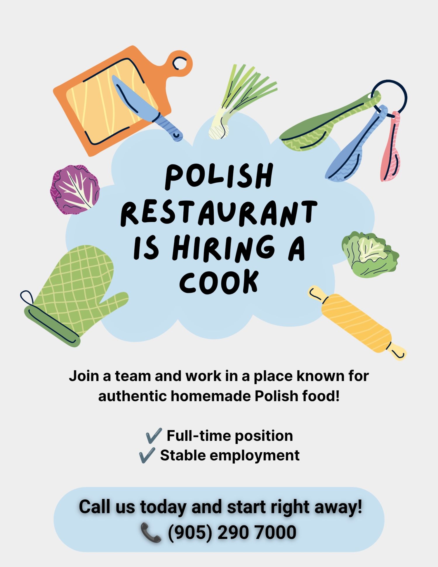 Do you enjoy cooking, are passionate about food, and have experience working in a kitchen? We need you! We're looking for a cook for a Polish restaurant in Mississauga. Full-time position. Please contact us: 905 290 7000.